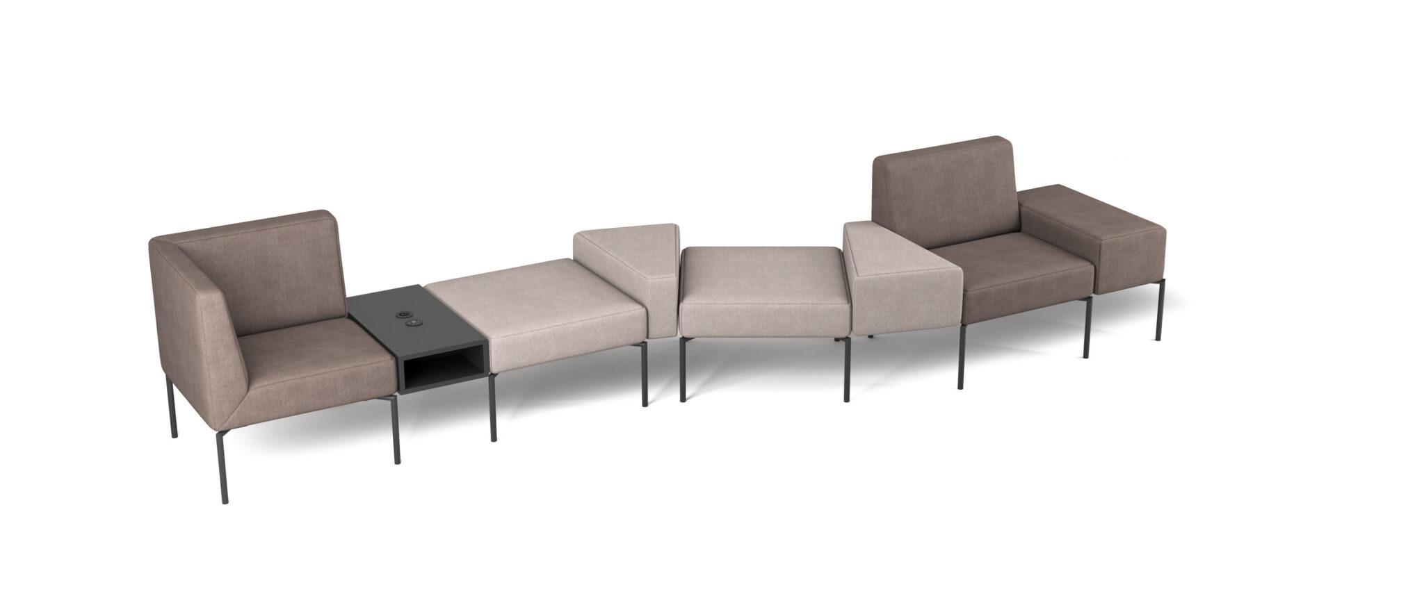 Adding a touch of lightness and character are its metal legs, which come in a range of finishes. The filling and covering materials are durable and fireproof, as public space demands.