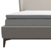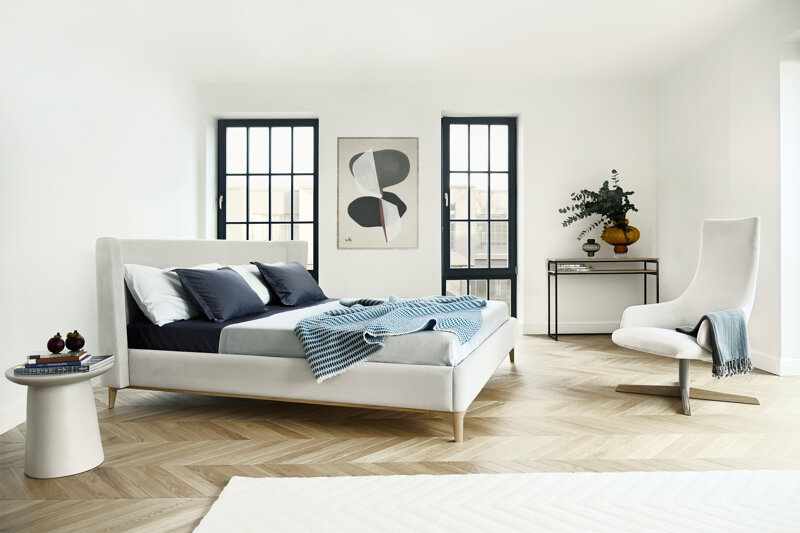 The curved edges of Viola’s headboard serve to define the space around it and showcase the bed even when covered with a fabric in a neutral tone. Its timber leg frame is modest but refined, making the bed the centrepiece of the room. Viola has no sharp corners and comes with a soft, upholstered frame.