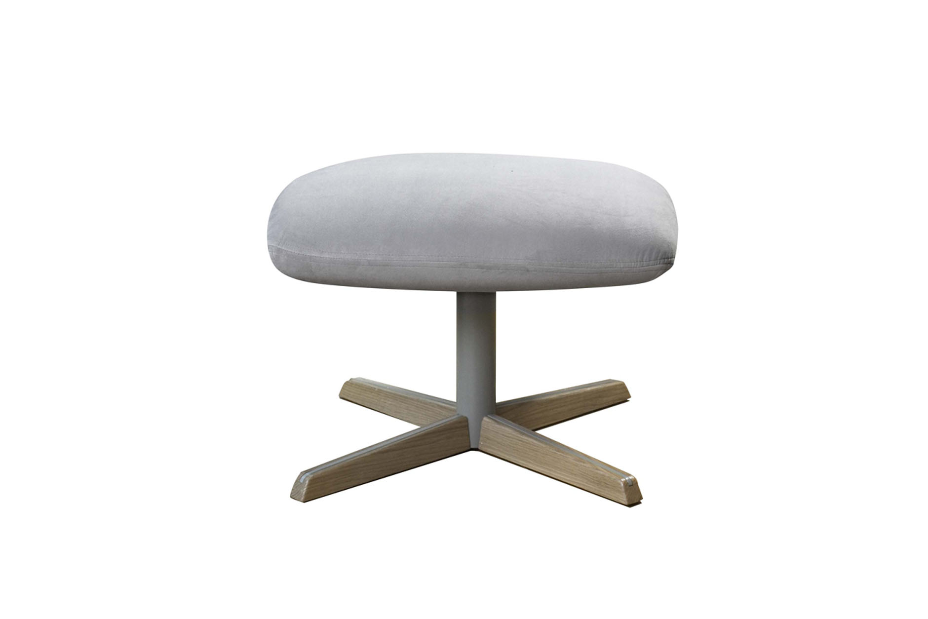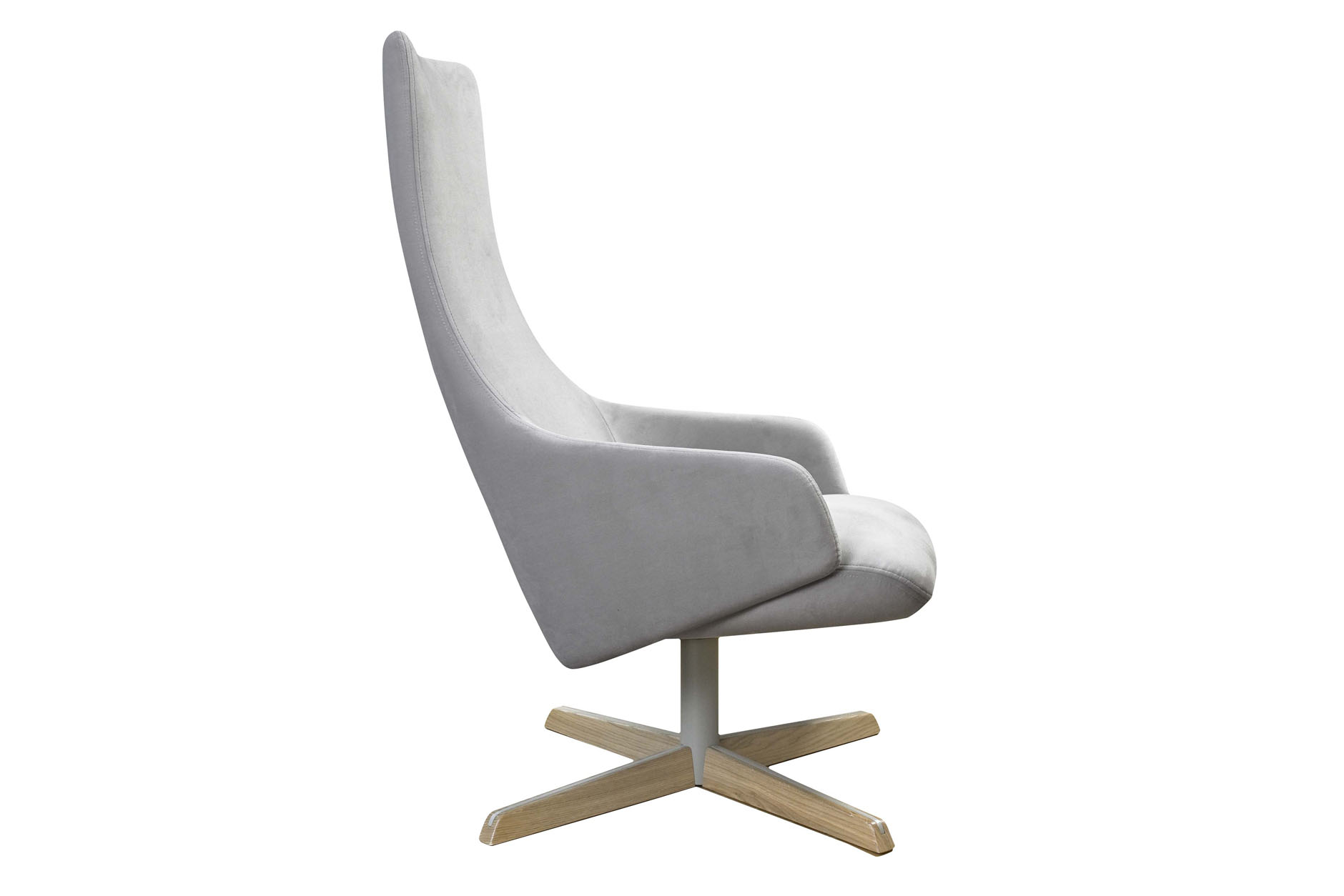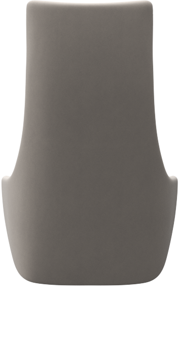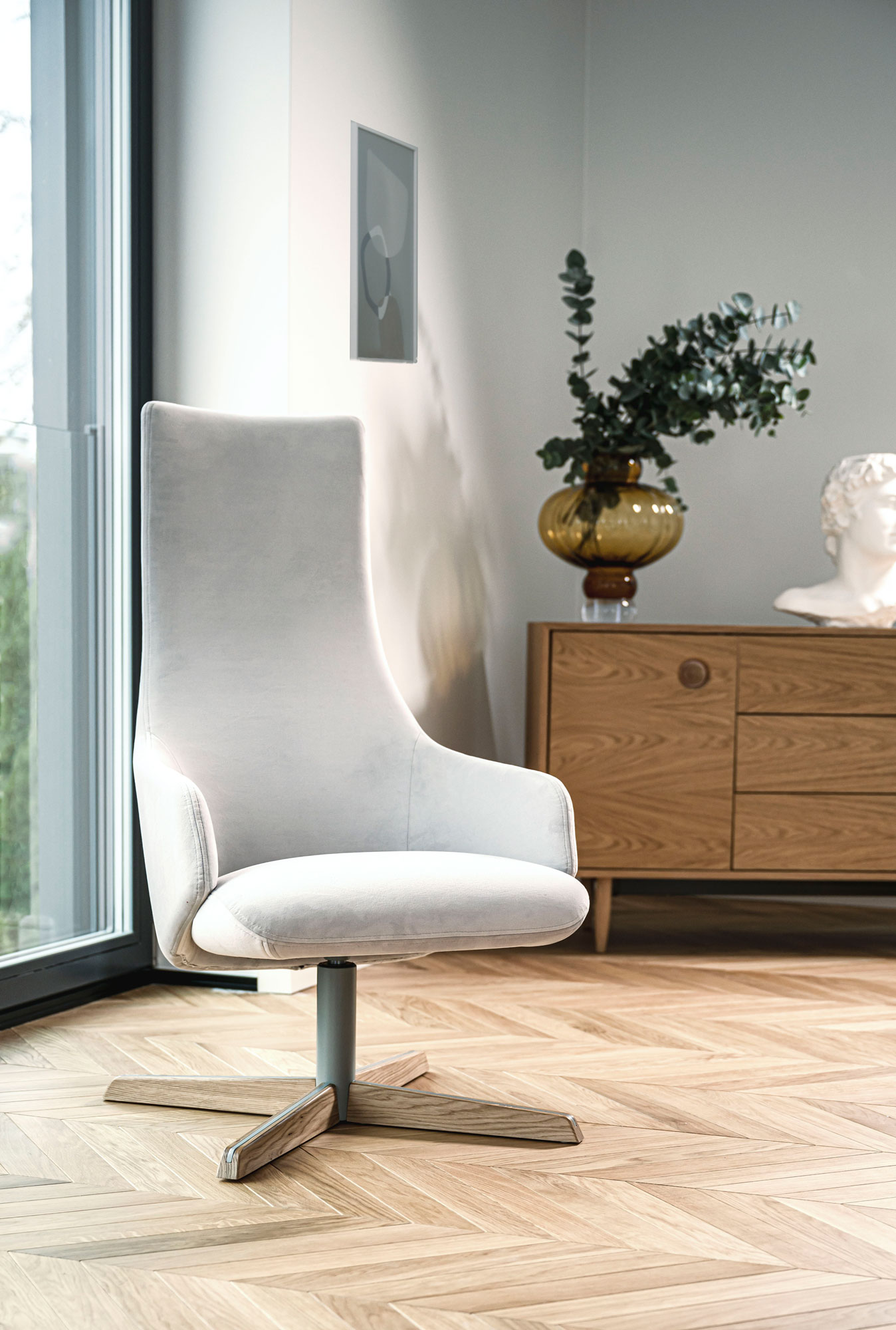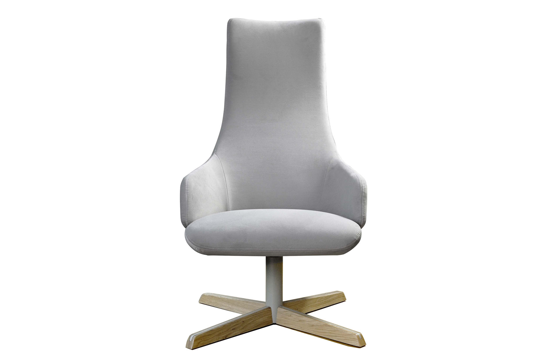 Guaranteeing the durability of the armchair is its strong metal frame, cushioned with high resiliency moulded PU foam. Its solid timber revolving foot is offset with a contrasting metal line – a small but highly effective detail in an armchair that is already unique in form.