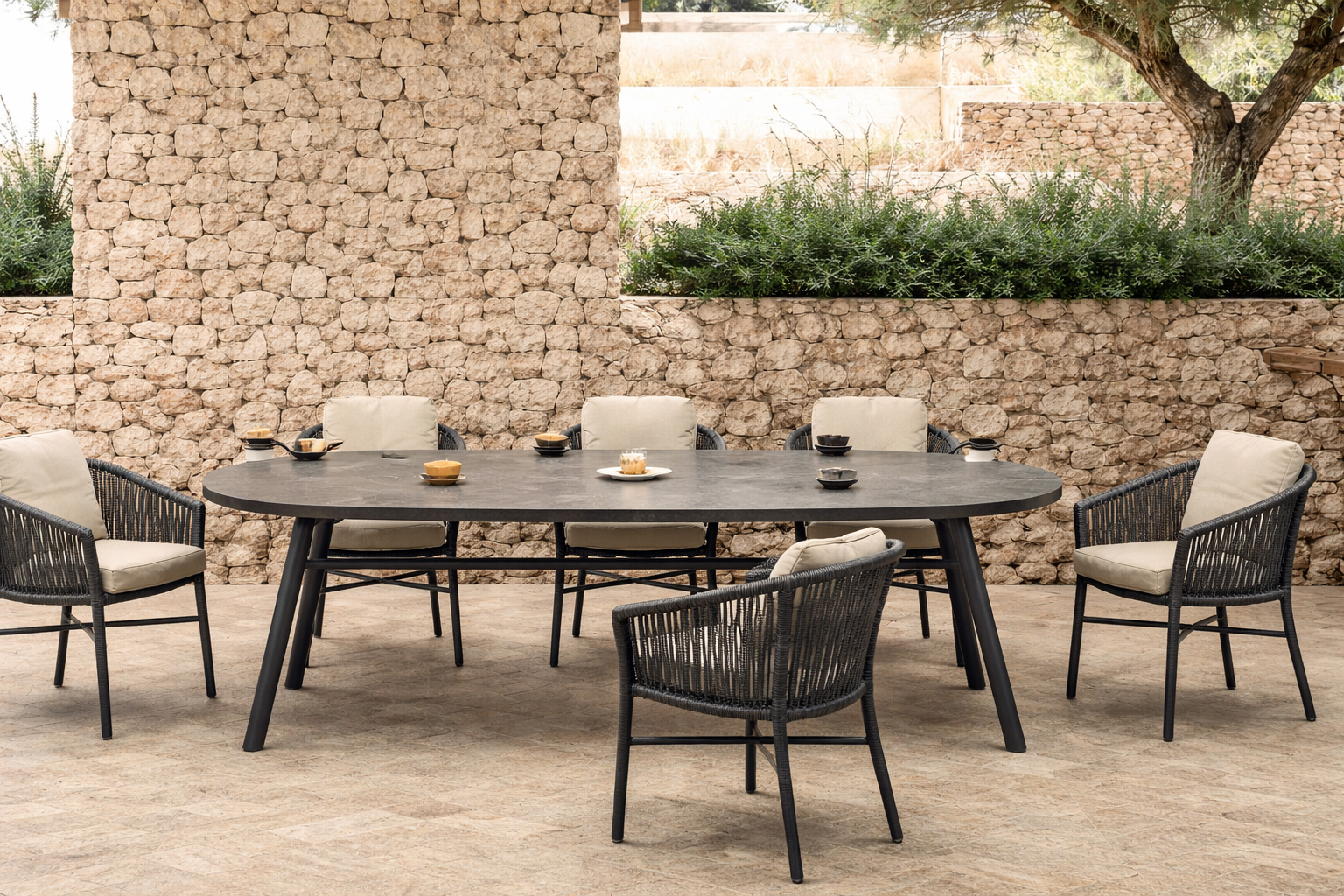 Travertiinimustriga tehiskivist lauaplaat on vastupidav plekkidele ja kergesti hooldatav ning talub nii tugevat tuult, intensiivset päikesevalgust kui ka tugevat vihma. See teeb lauast usaldusväärse valiku Eesti muutlikes oludes.