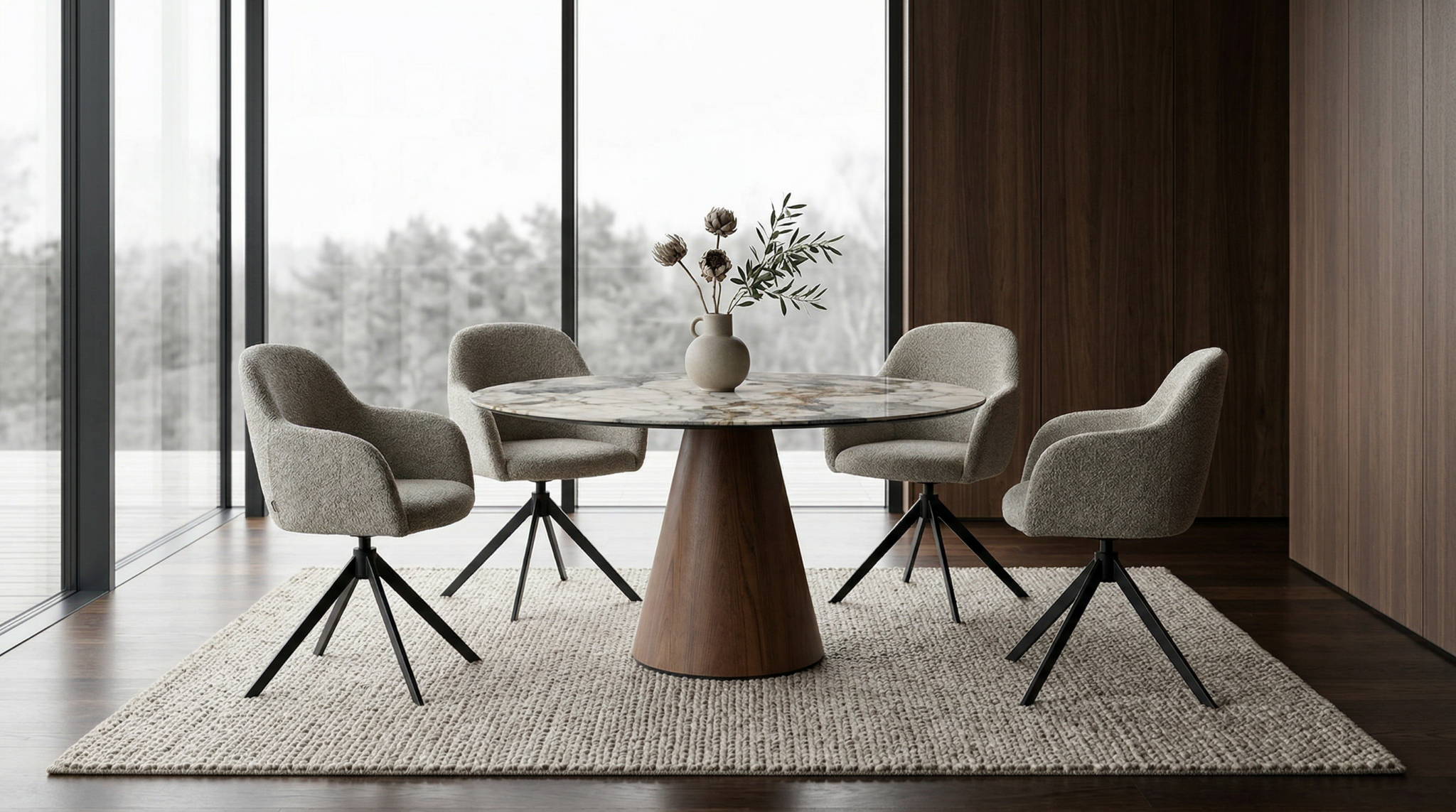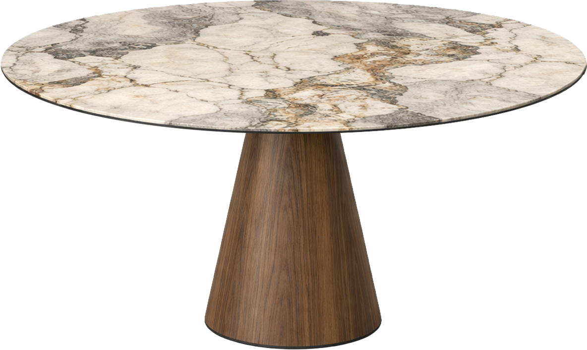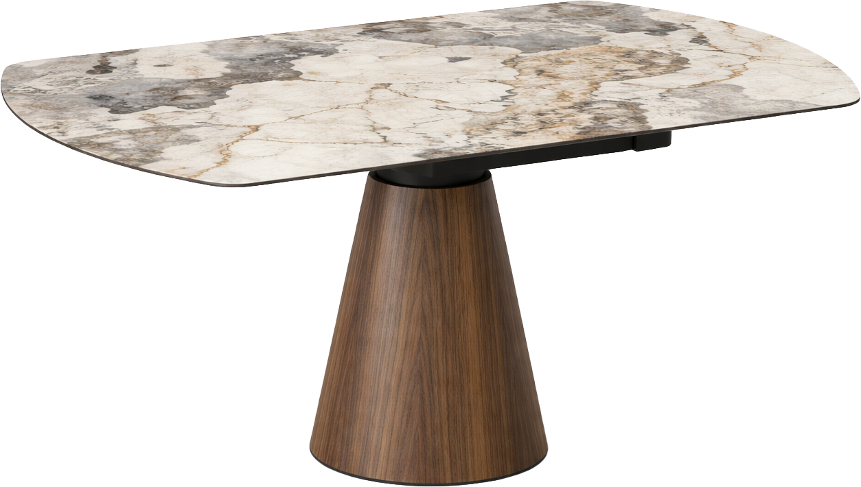 Söögilaua pealiplaat on valmistatud keraamikast ning tugevdatud karastatud klaasiga, tagades vastupidava ja kvaliteetse tulemuse. Keraamiline pealispind on kuuma-, pleki- ja kriimukindel – loodud päriselt kasutamiseks, mitteainult vaatamiseks. Matte Pandora viimistlus annab elegantse kivilaadse ilme ja toob ruumi luksuslikkust. Must metallraam lisab söögilauale modernse joone ning pähkliviimistlusega jalg soojust, luues tasakaaluka ja stiilseterviku.