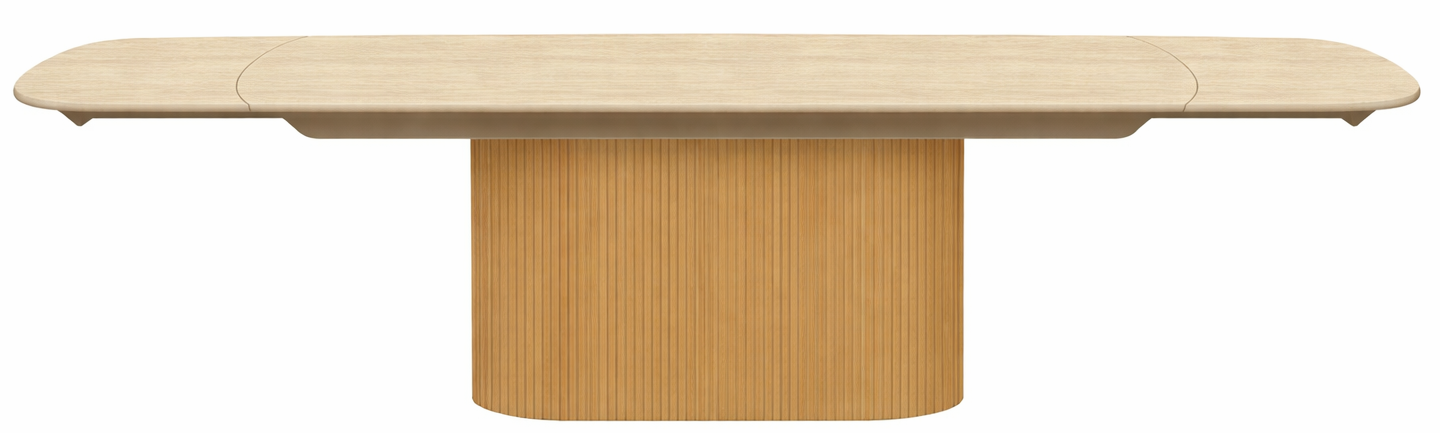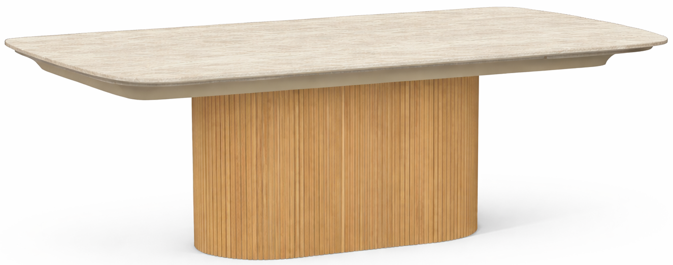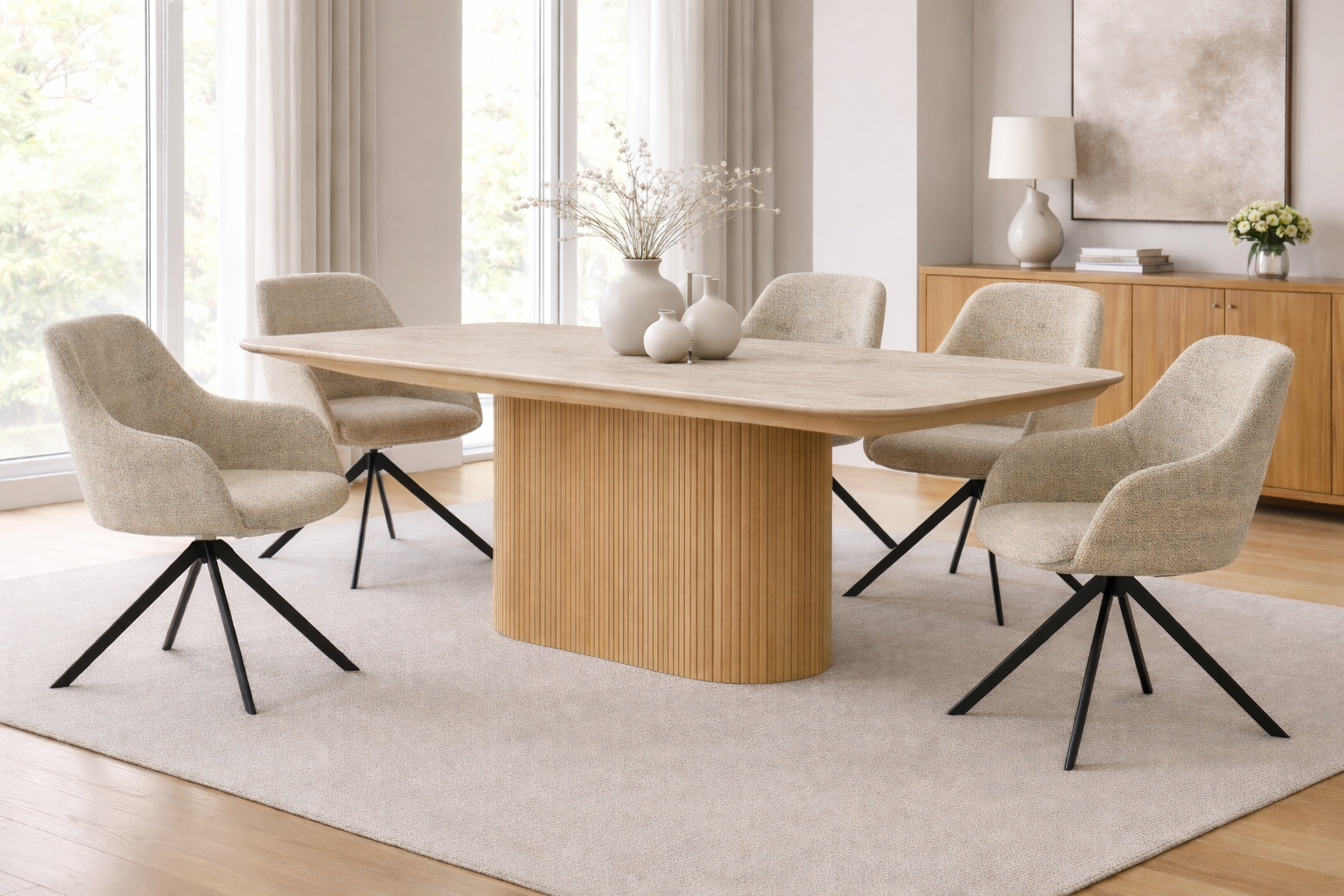Täiskeraamiline söögilaua plaat on viimistletud Matte Italian White Travertine toonis. Hele, Itaalia travertiinist inspireeritud toon toob ruumi õhulisust ja loomulikku elegantsi ning matt pind rõhutab kivi mustrimängu. Söögilaua naturaalses tammetoonis jalad loovad tasakaalu heleda keraamilise pealispinnaga ning vertikaalsed liistud annavad vormile rütmi ja arhitektuurse selguse.